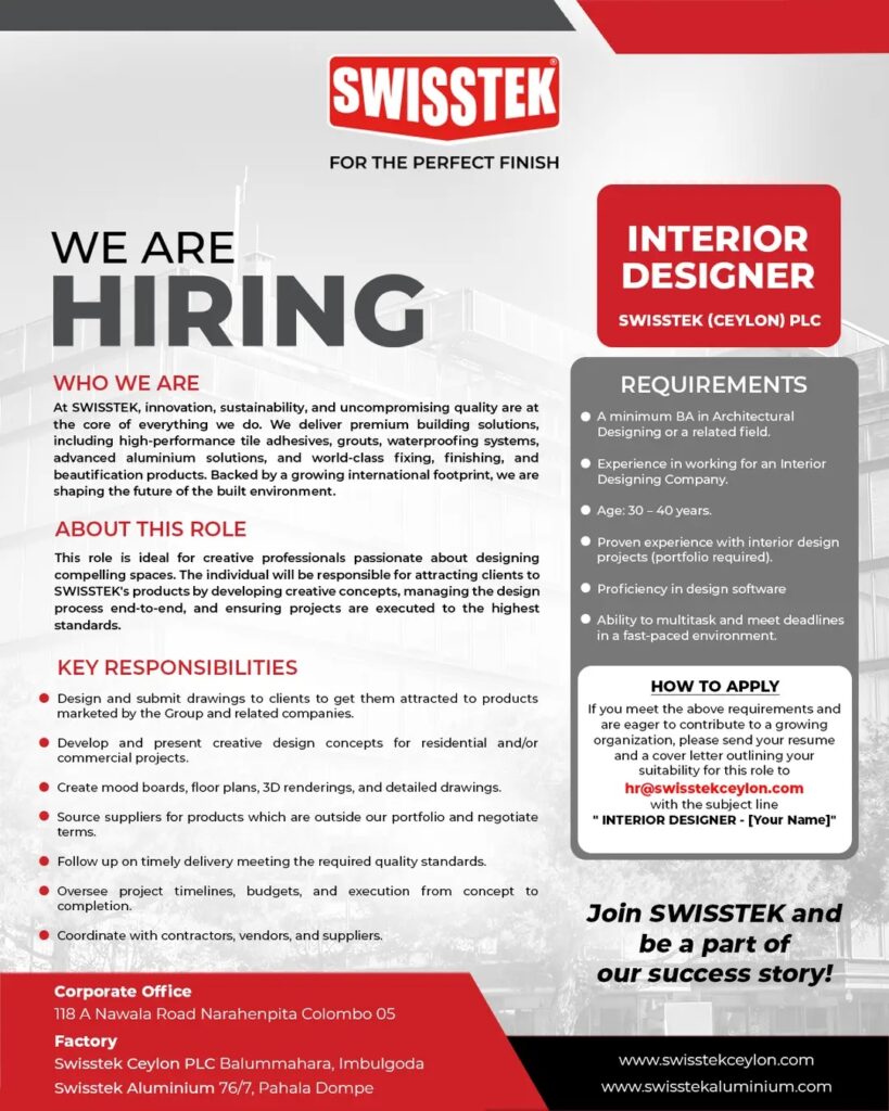 We’re looking for a creative and detail-oriented professional to join SWISSTEK as an Interior Designer.