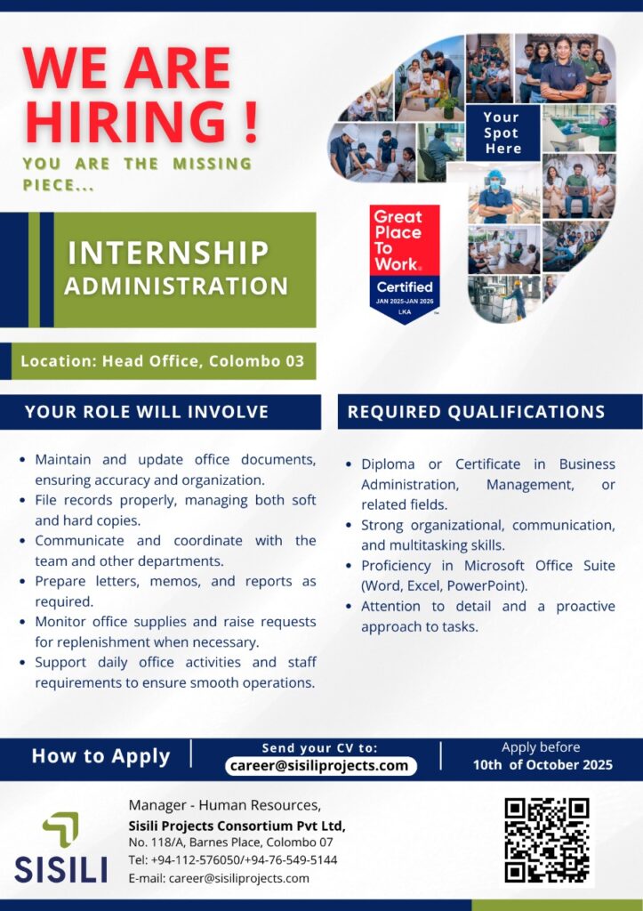 Apply now :+ career@sisiliprojects.com