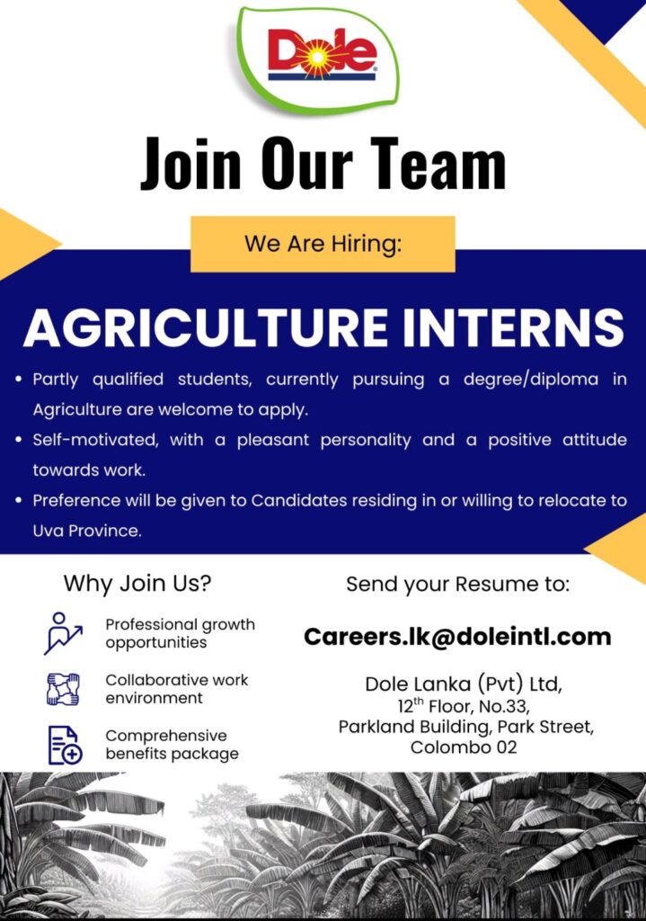 Dole Lanka (Pvt) Ltd is on the lookout for enthusiastic Agriculture Interns to join our growing team.