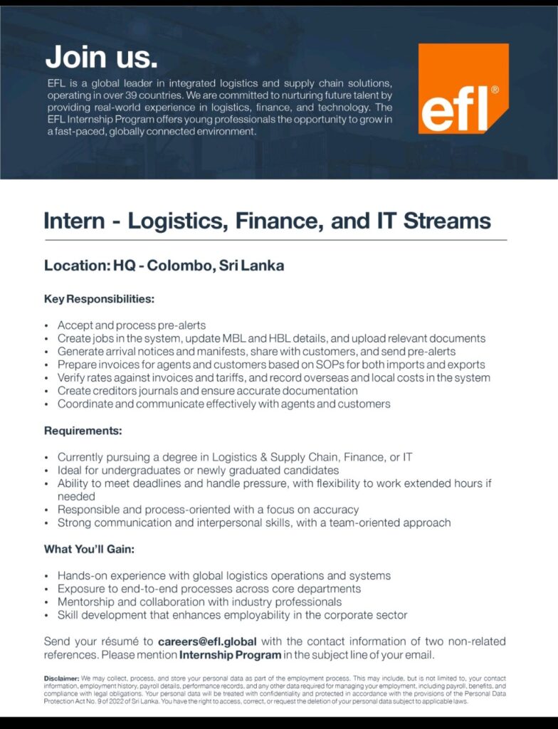 Interested candidates are kindly requested to submit their CVs to careers@efl.global