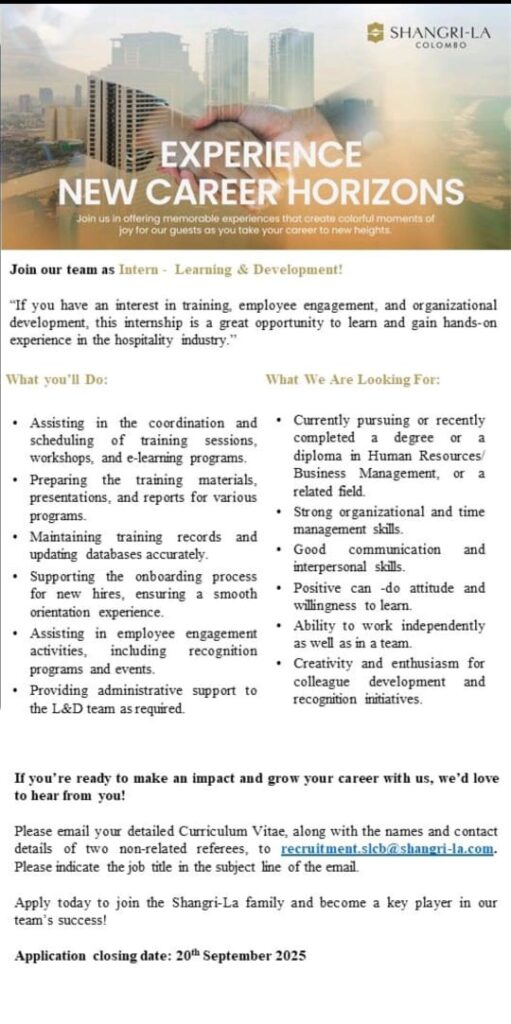 We are seeking a Learning & Development Intern. Join Shangri-La Sri Lanka and be part of a team dedicated to creating unforgettable luxury experiences!