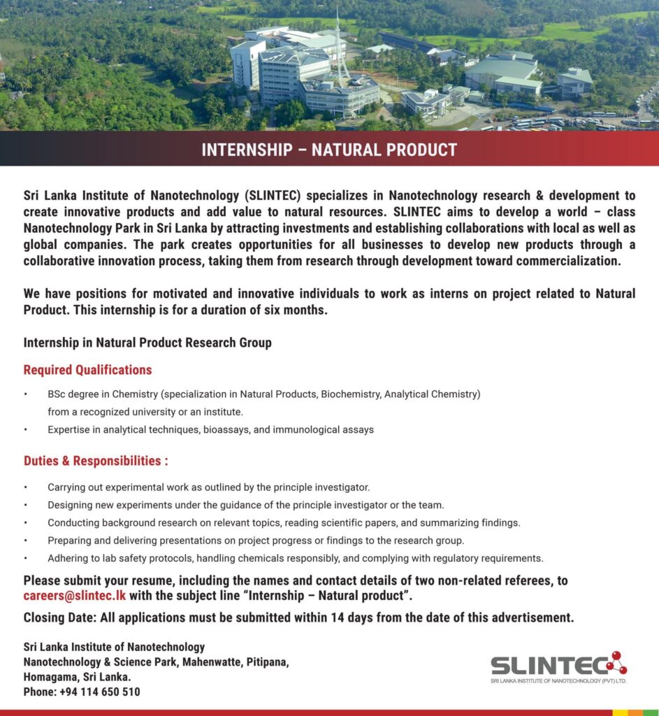 Are you ready to turn scientific curiosity into commercial reality? The Sri Lanka Institute of Nanotechnology (SLINTEC) is looking for motivated and innovative individuals to join our Natural Product Research Group for a transformative six-month internship.