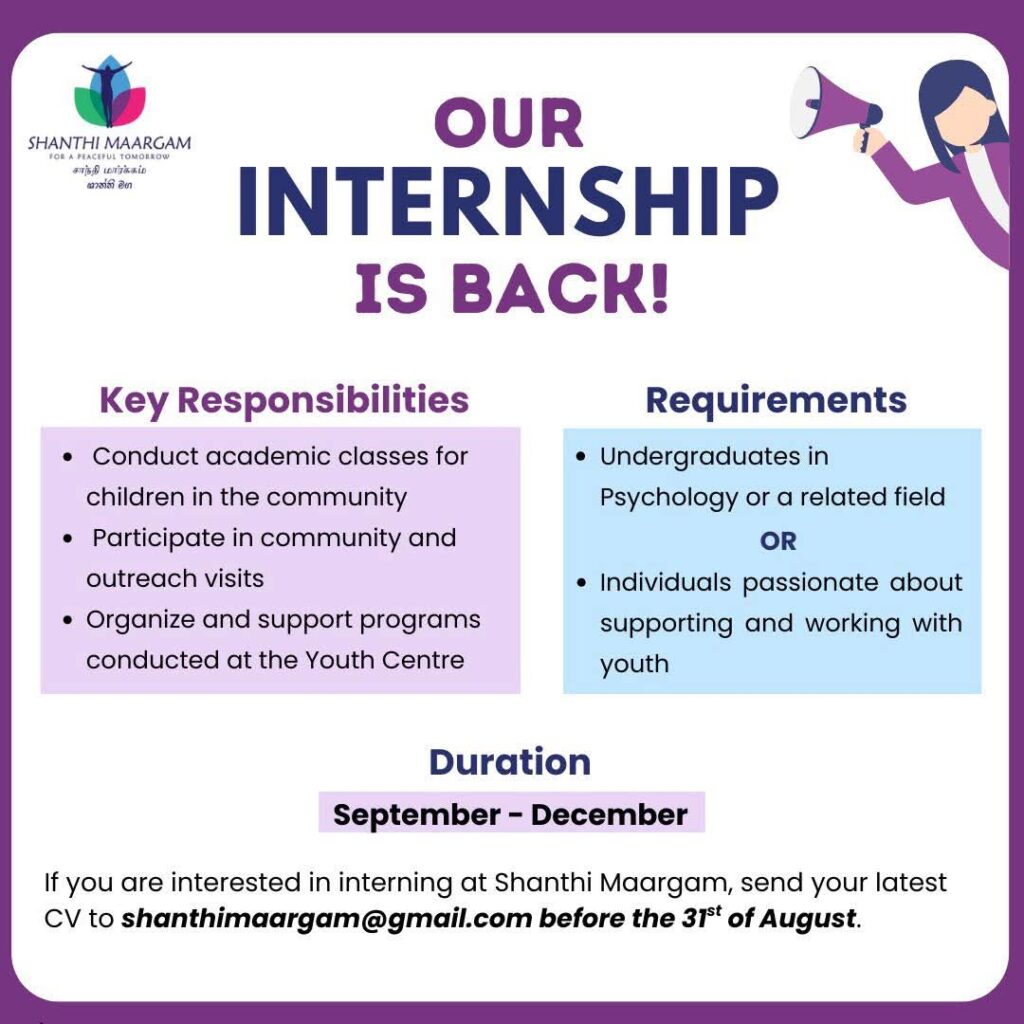If you meet the requirements, send your CV to shanthimaargam@gmail.com
