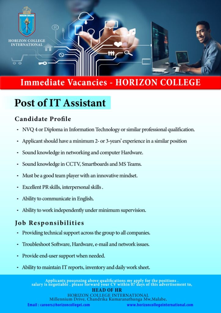 IT Jobs IT Assistant 20 seconds ago Deadline :- 30th January 2026 Company:- Horizon College Apply Now :- careers@horizoncollegei.com Location:- Malabe Post navigation Previous: Manager – Health & Safety Related Vacancies Internship IT Jobs Software Engineering Internship 5 minutes ago IT Jobs ASE/ QA/ Full Stack Developer/ WordPress Developer / Mobile App Developer 8 minutes ago IT Jobs Associate Cloud Engineer/ Cloud Engineer – AWS 2 days ago