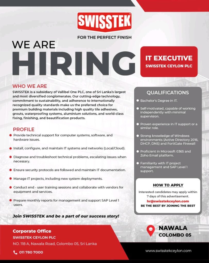 Swisstek Ceylon PLC is hiring an IT Executive! We’re seeking a proactive individual with a passion for supporting computer systems, networks, and IT projects.