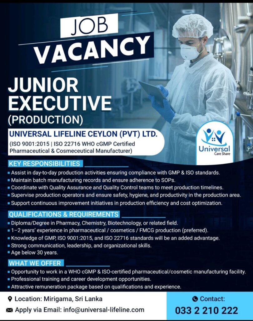 Universal Lifeline Ceylon (Pvt) Ltd, a WHO-cGMP | ISO 9001:2015 | ISO 22716 certified pharmaceutical & cosmeceutical manufacturer, is expanding our production team.