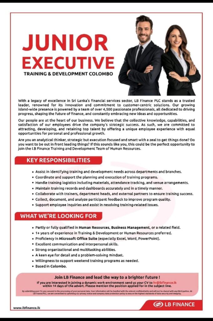 LB Finance is on the lookout for a passionate and driven Junior Executive – Training & Development to join our dynamic Human Resources team in Colombo.