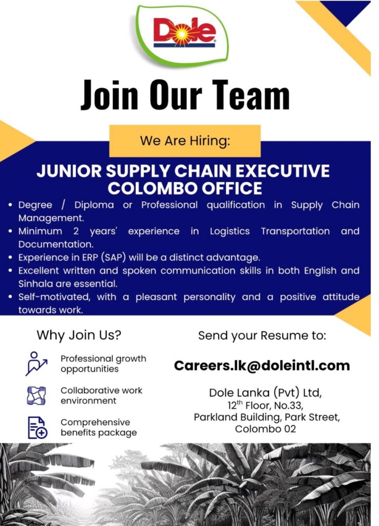 Join our dynamic team at Dole Lanka as a Junior Supply Chain Executive at our Colombo Office. If you’re passionate about logistics, documentation, and ERP systems, this is your chance to grow professionally in a collaborative environment.