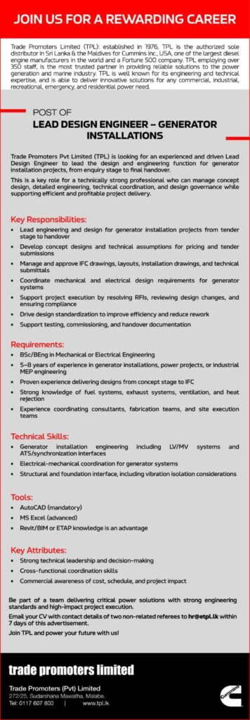 We are looking for an experienced Lead Design Engineer to lead generator installation projects from concept design to commissioning.