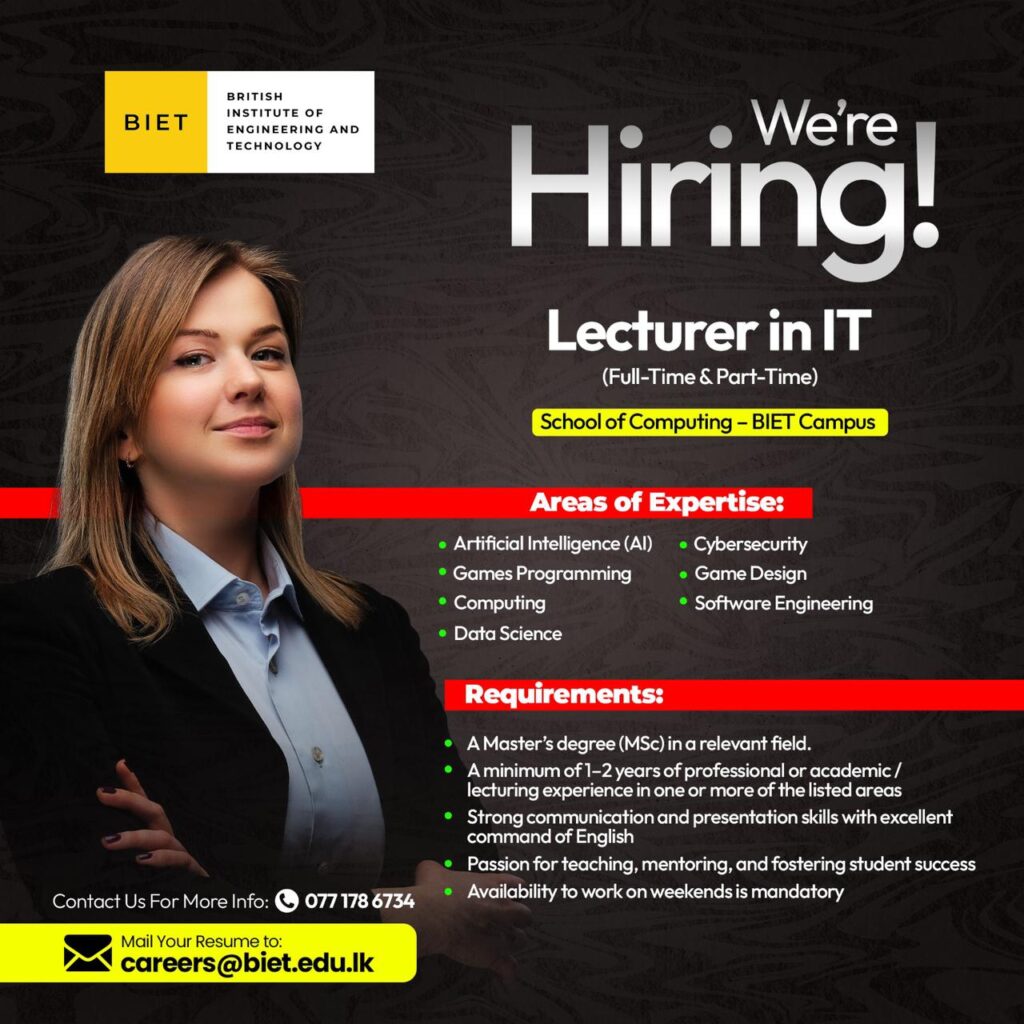 IT Jobs Lecturer Lecturer – IT 2 months ago Deadline:- 28th October 2025 Company:- BIET Full Time & Part Time Apply now :- careers@biet.edu.lk Post navigation Previous: HR InternshipNext: HR Executive – Payroll Related Vacancies Internship IT Jobs Remote Work opportunity AI/ML Internship 10 hours ago Art Digital Marketing Graphic Designer Internship IT Jobs Digital Media Executive/ Creative Designer/Accounts Manager/ Internship 18 hours ago IT Jobs UX/ UI Designer 1 day ago