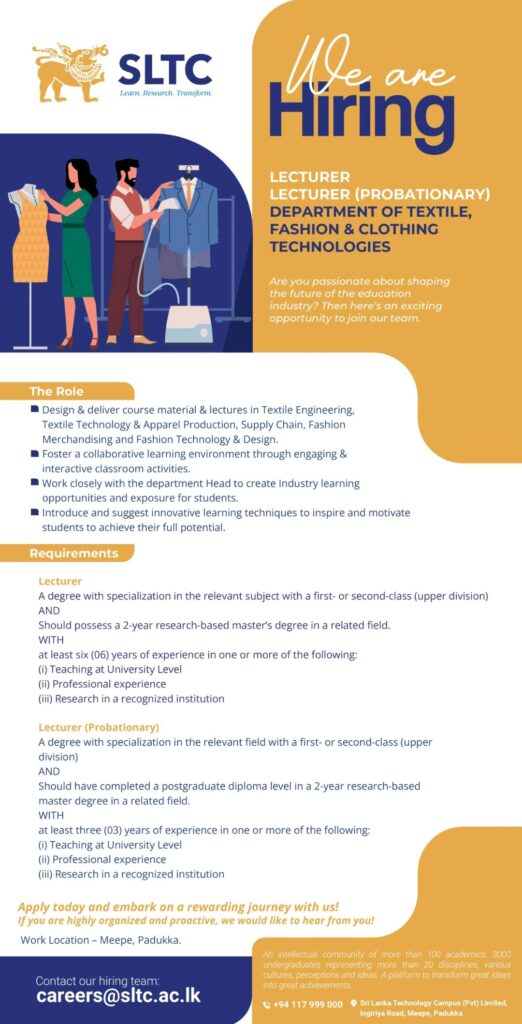 Apply now :- careers@sltc.ac.lk