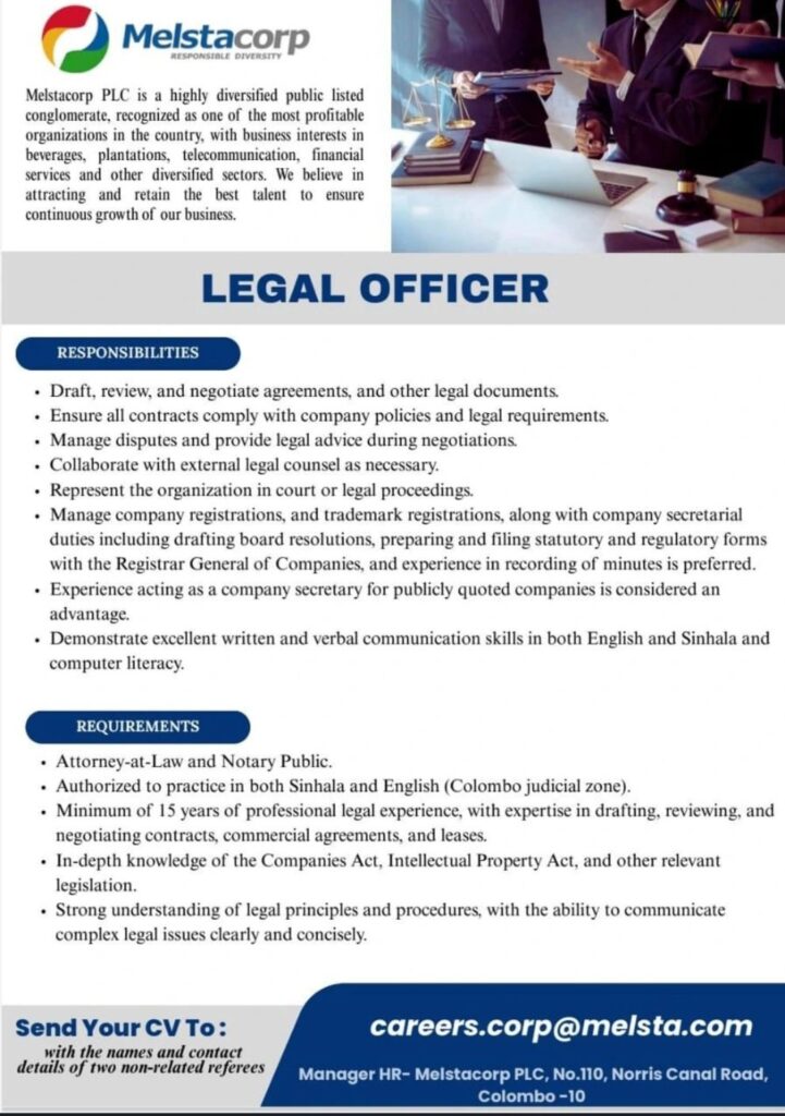 Address: Manager HR – Melstacorp PLC, No.110, Norris Canal Road, Colombo-10