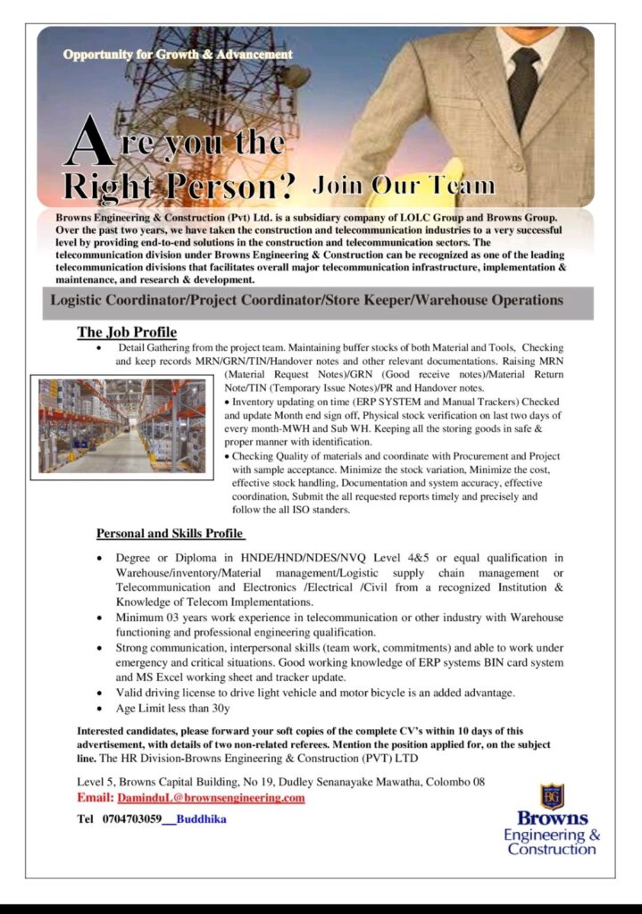 Degree or Diploma in HNDE/HND/NDES/NVQ Level 4&5 or equal qualification in Warehouse/inventory/Material management/Logistic supply chain management or Telecommunication and Electronics/Electrical Civil from a recognized Institution & Knowledge of Telecom Implementations.