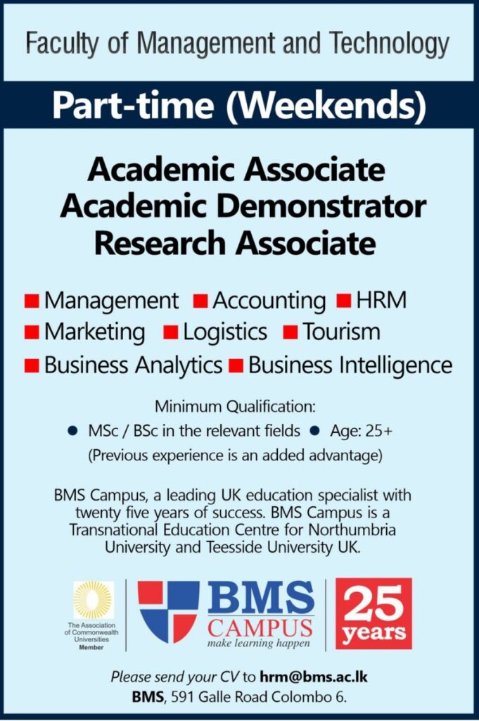 BMS Campus is hiring! We’re looking for part-time -weekend Academic & Research staff for our Faculty of Management & Technology.