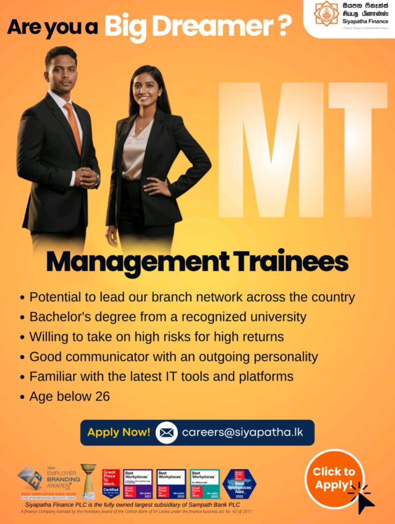 Siyapatha Finance PLC is inviting applications for our Management Trainee program. We are looking for dynamic graduates under the age of 26 who aspire to become leaders in the financial sector.