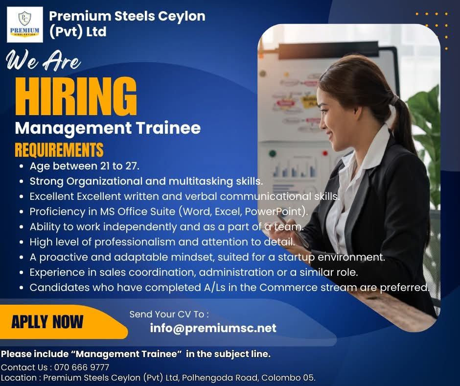 Premium Steels Ceylon (Pvt) Ltd is looking for motivated and dynamic individuals to join our team as Management Trainees.