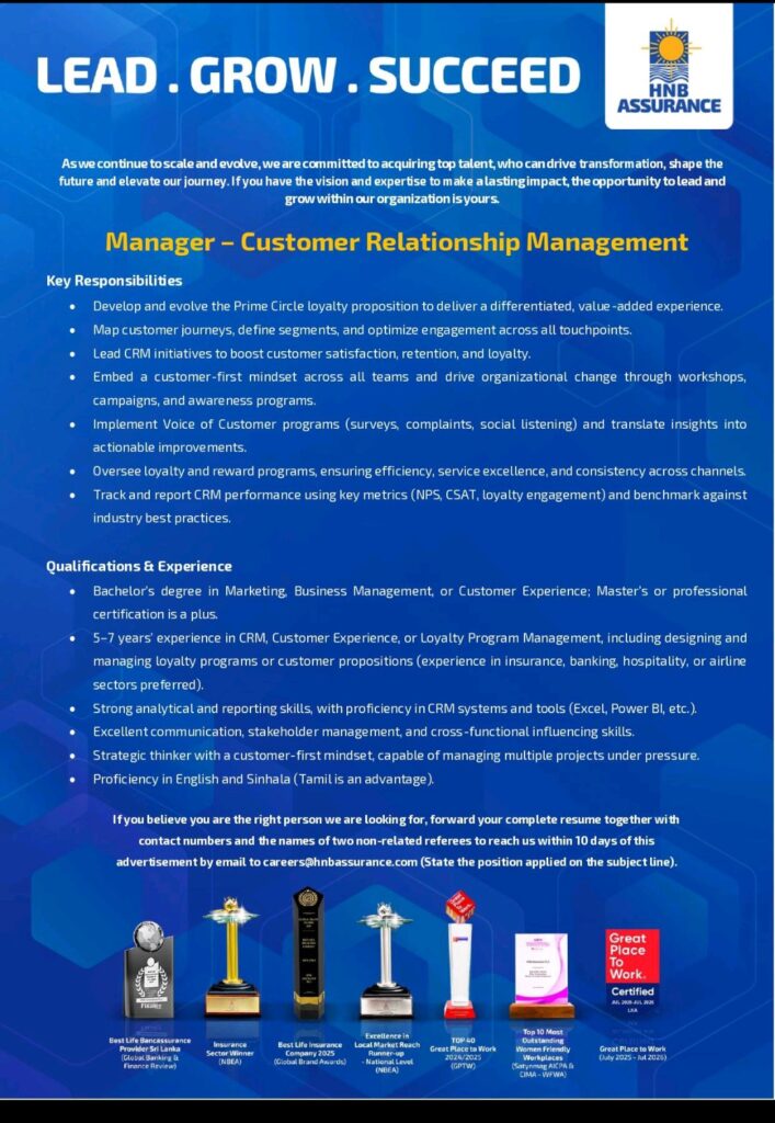 Looking out for someone who could take on the position of Manager – Customer Relationship Management.
