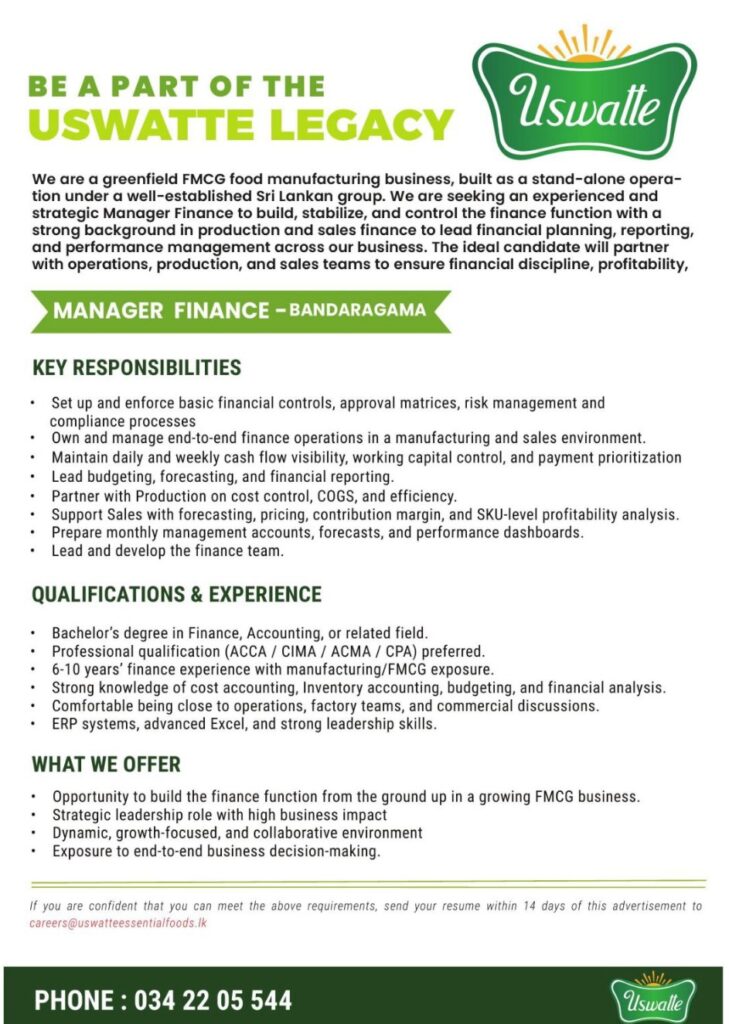 Uswatte Essential Foods (Pvt) Ltd is looking for an experienced Manager – Finance to join our team at Bandaragama.