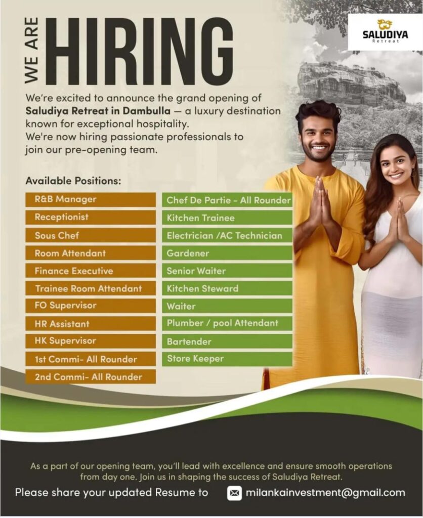 Join the pre-opening team of Saludiya Retreat in Dambulla – a luxurious new destination known for outstanding hospitality! 🏞️✨