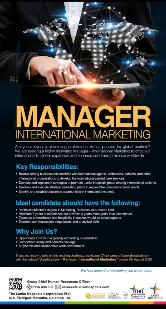 We’re Hiring! Join Lanka Hospitals as our next Manager – International Marketing and be a driving force behind our global brand expansion. If you’re a dynamic marketing professional with a passion for international business, strong relationship-building skills, and a vision for growth we want to hear from you!