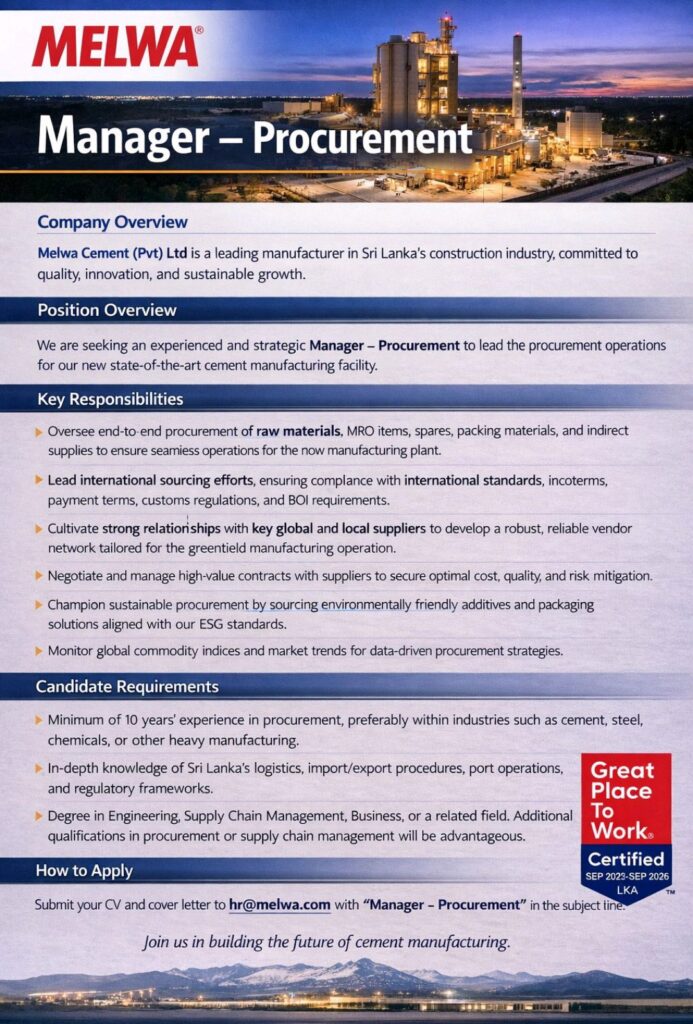 Melwa Cement (Pvt) Ltd is looking for an experienced Manager – Procurement to join our dynamic team at our state-of-the-art cement manufacturing facility!
