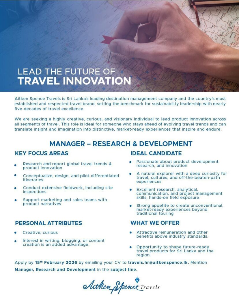 Aitken Spence Travels is seeking a Manager -Research & Development to drive product innovation and create distinctive, market-ready travel experiences across all travel segments.