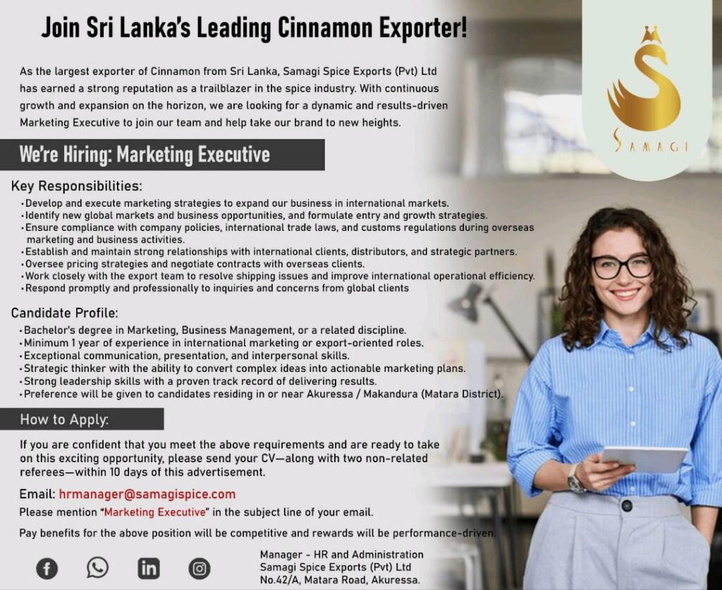 Are you ready to take your marketing career to global heights? Samagi Spice Exports (Pvt) Ltd, Sri Lanka’s largest cinnamon exporter, is on the lookout for a dynamic and results-driven Marketing Executive to help us expand into international markets.