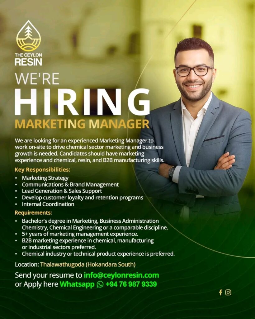 We are looking for an experienced Marketing Manager to work on-site and drive marketing and business growth in the chemical sector. Candidates should have strong marketing expertise along with chemical, resin, and B2B manufacturing knowledge.