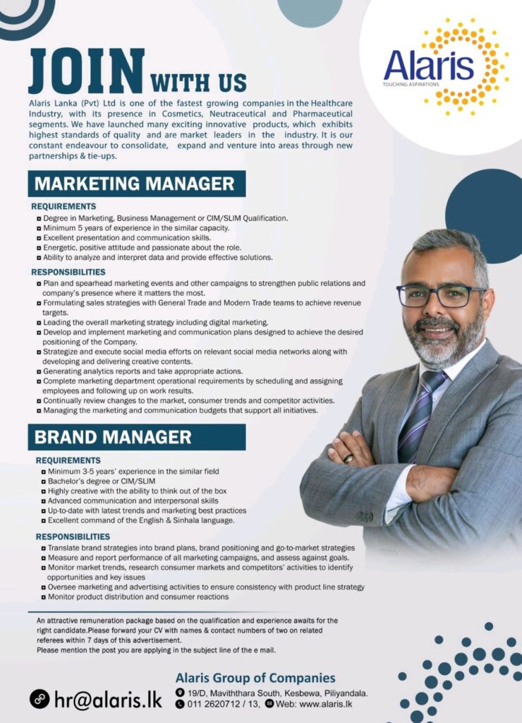 Alaris Lanka Group of Companies is looking for talented and driven professionals to join our growing team as: