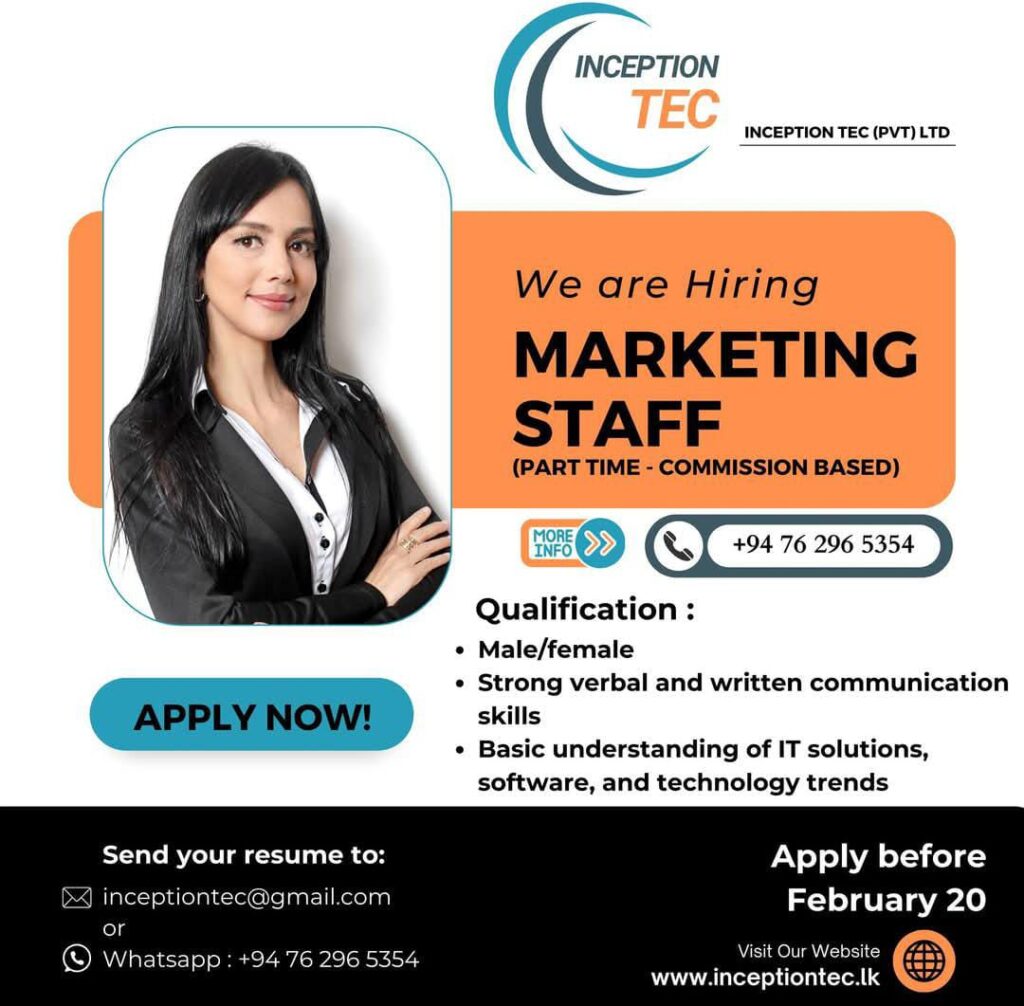 Part time Sales and Marketing Marketing Officer Part Time 10 months ago Company:- Inception Tec Sri Lanka part time job vacancy Deadline :- 20 th February 2025 Post navigation Previous: Engineer/ Assistant Engineer MechanicalNext: Mechanical Engineer Related Vacancies Internship IT Jobs Sales and Marketing Internship – Frontend Developer/ Marketing / Management 3 days ago Sales and Marketing Sales Executive 3 days ago Sales and Marketing Marketing & Branding Executive 4 days ago