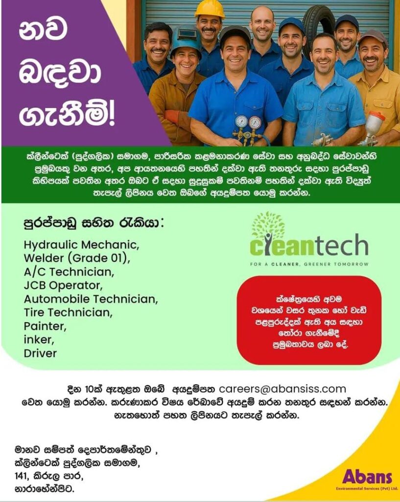 Vacancies: – Hydraulic Mechanic, Welder (Grade 01), A/C Technician, JCB Operator, Automobile Technician, Tire Technician, Painter, Tinker, Driver
