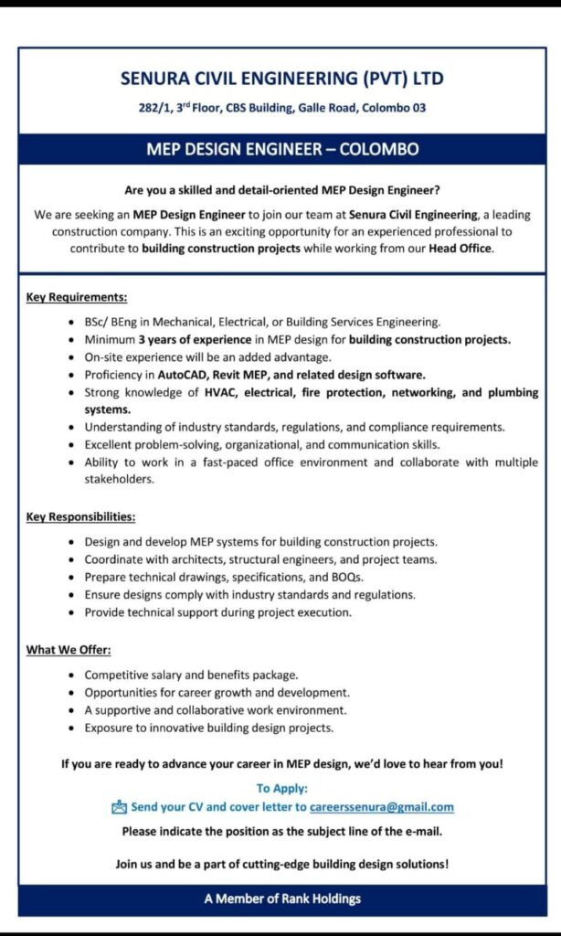 Join our team Senura Civil Engineering (PVT) LTD as an MEP Design Engineer and contribute to innovative building construction projects while working from our Head Office!