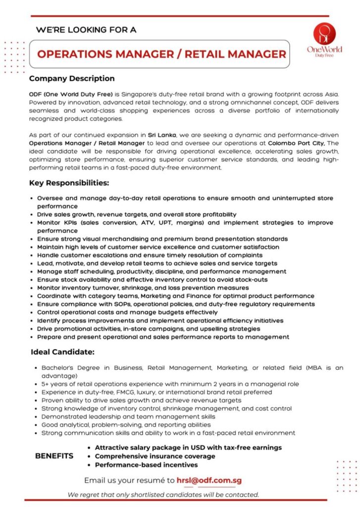 Join ODF (One World Duty Free) as an Operations Manager / Retail Manager and lead retail excellence at Colombo Port City, Sri Lanka.