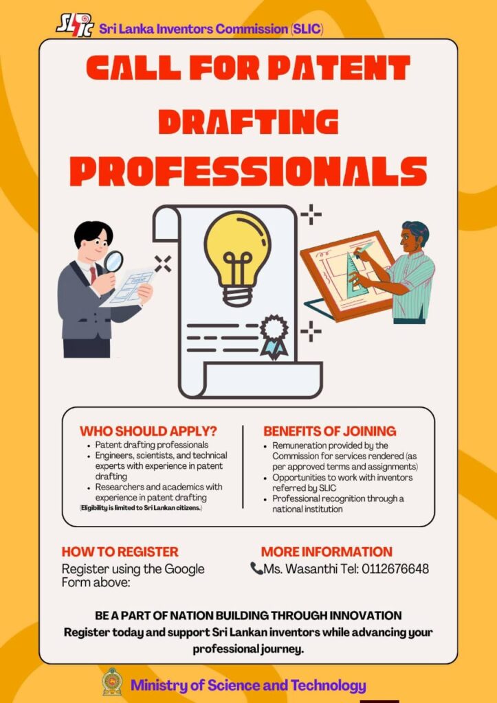 The Sri Lanka Inventors Commission (SLIC) is calling for Patent Drafting Professionals to register and join with us in strengthening Sri Lanka’s innovation ecosystem.