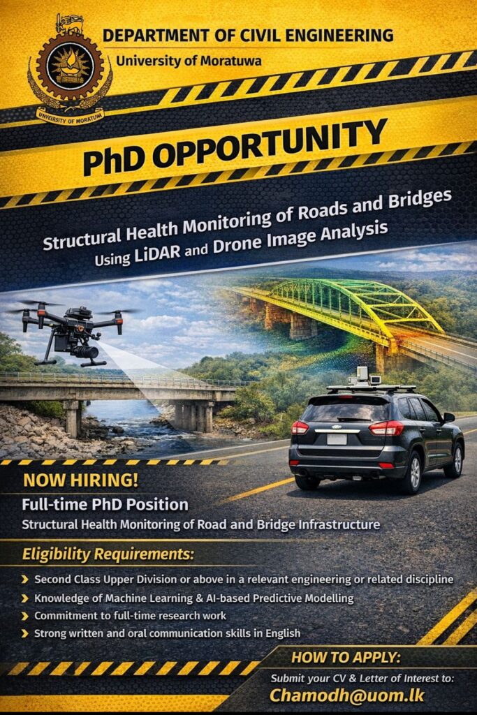 The Department of Civil Engineering, University of Moratuwa, invites applications for a full-time PhD position in the area of structural health monitoring of road and bridge infrastructure using LiDAR data and drone-based image analysis. The research will focus on data-driven condition assessment and Al-based predictive modelling.