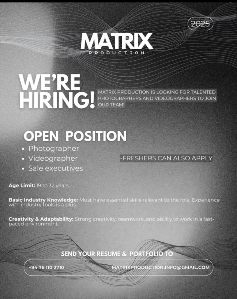 If you’re ready to be part of a creative, dynamic team, send your resume and portfolio to:- matrixproduction.info@gmail.com