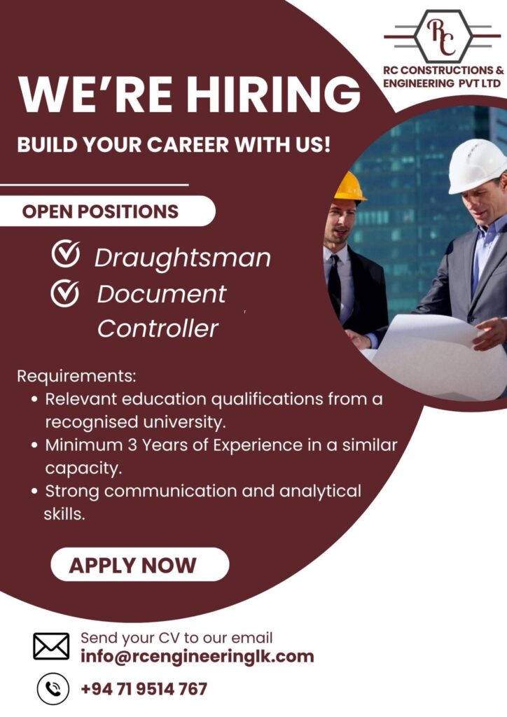 RC Constructions & Engineering Company Pvt Ltd is seeking qualified and experienced professionals for an upcoming warehouse project in Kimbulapitiya.