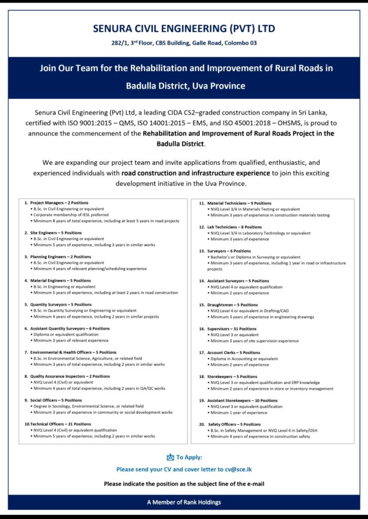Senura Civil Engineering (PVT) LTD is expanding its team for the Rehabilitation and Improvement of Rural Roads in the Badulla District, Uva Province, a major development initiative spanning five project LOTs.