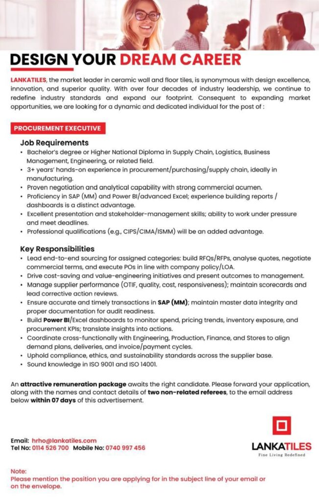 LANKATILES is looking for a skilled Procurement Executive to strengthen our supply chain operations. In this role, you will manage purchasing activities, negotiate with suppliers, and support data-driven decision-making to ensure cost efficiency and operational excellence.