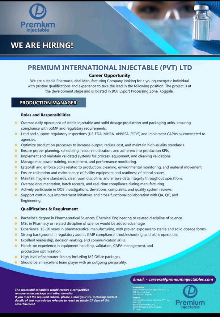 Are you a results-driven leader with hands-on experience in pharmaceutical production? We are looking for a production manager to lead and optimize our manufacturing operations.