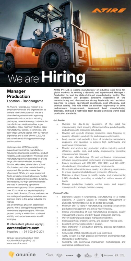 Atire Pvt Ltd – Located in Bandaragama (under Anunine Holdings), a global manufacturer of solid tyres, is seeking an experienced Production Manager to lead our solid tyre manufacturing operations.