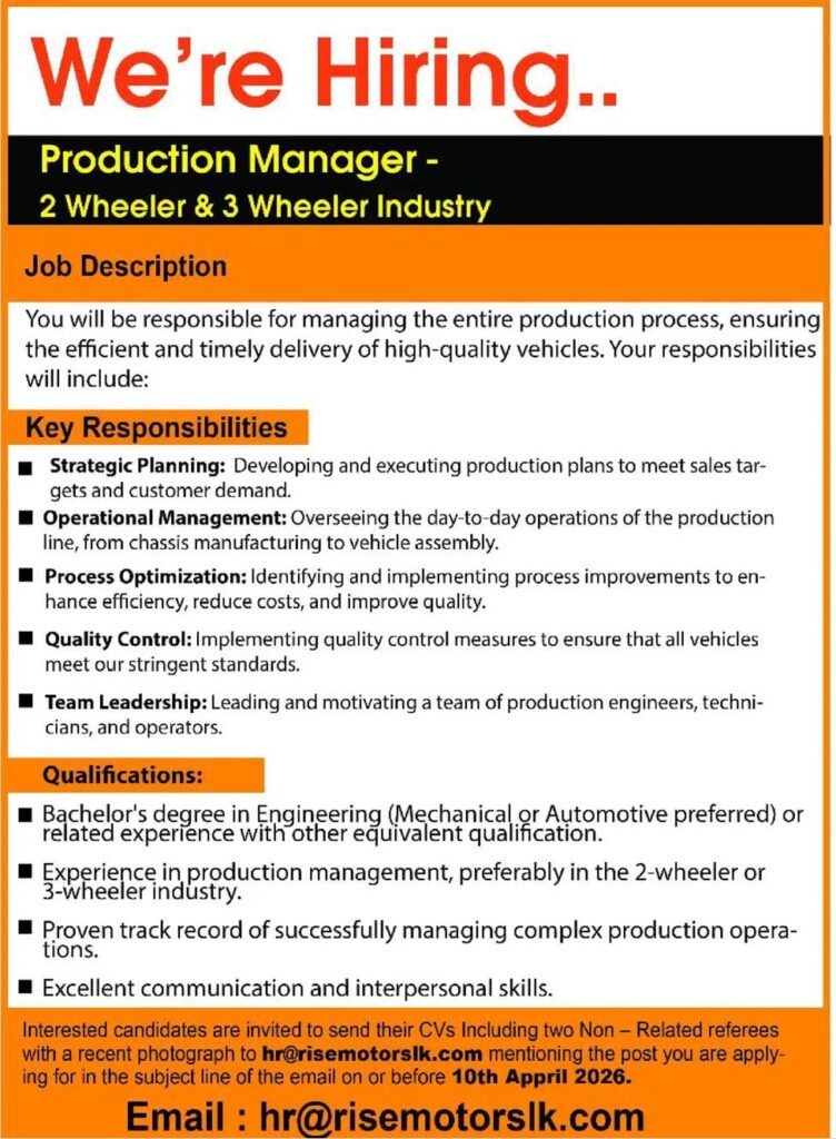 An opportunity for you to join our company KD Rise as a Production Manager with an attractive salary