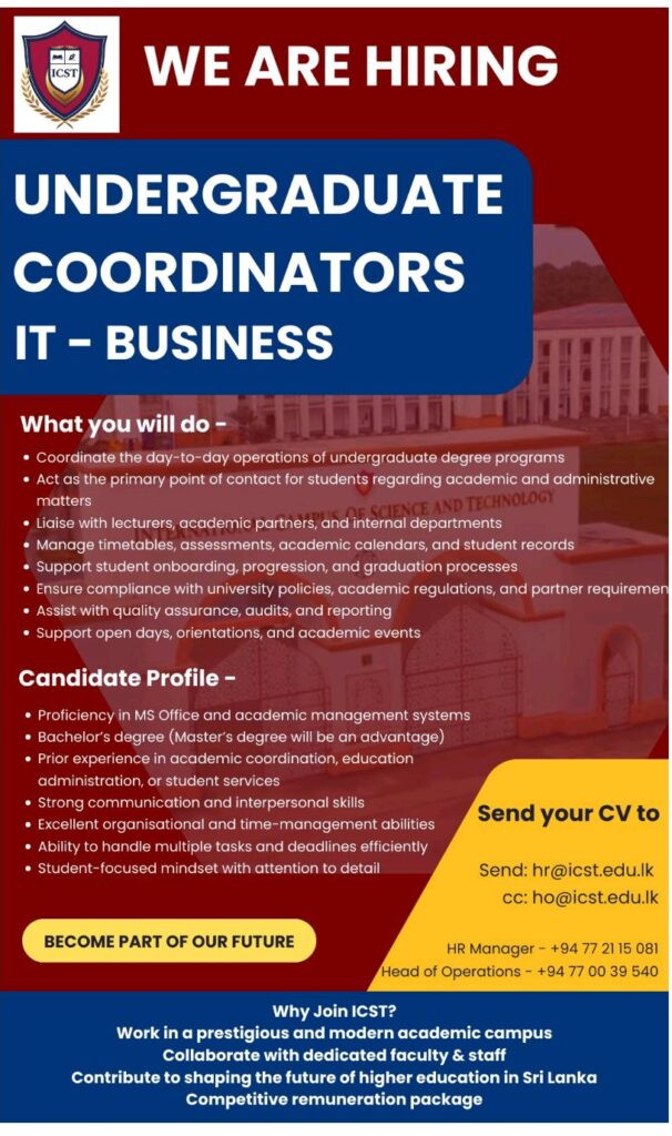 ICST University Park invites applications for the position of Undergraduate Degree Program Coordinator. This role is ideal for a motivated professional who is passionate about higher education and student success. The Coordinator will play a key role in ensuring the smooth academic and administrative delivery of undergraduate degree programs while enhancing the overall student experience.