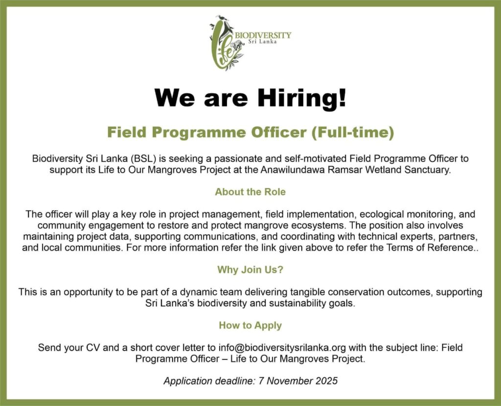 This is a unique opportunity to work at the intersection of biodiversity conservation and community empowerment, contributing directly to Sri Lanka’s sustainability goals.