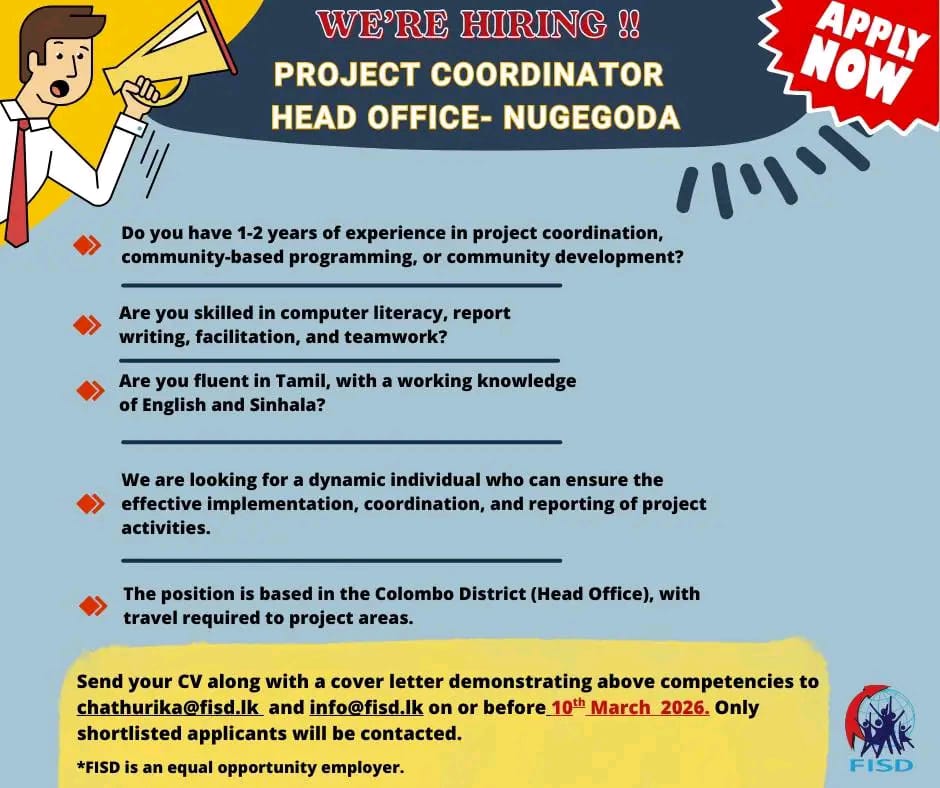 Join us as a Project Coordinator – Head Office (Nugegoda) and be part of a team committed to advancing child rights, gender equality, and healthy, empowered communities across Sri Lanka.