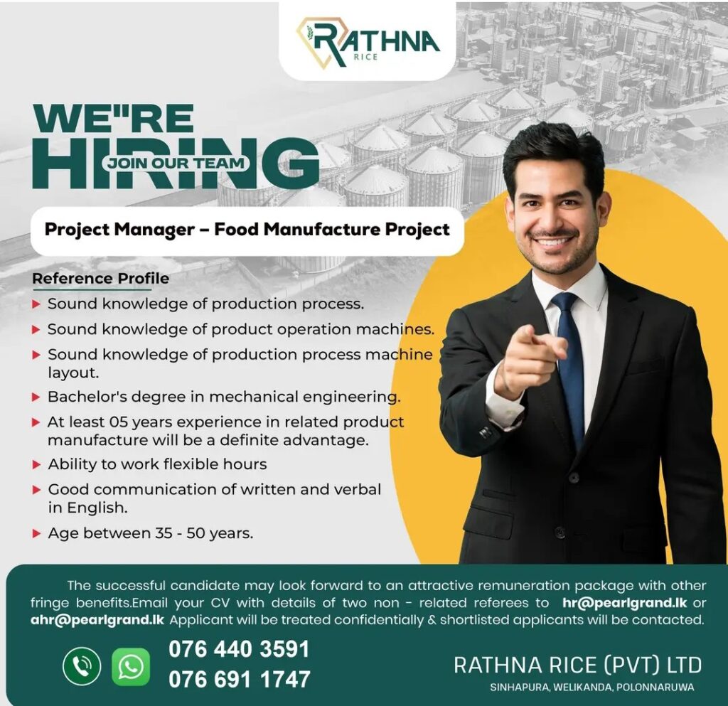 Immediate vacancy Rathna Rice (Pvt) Ltd is looking for a Project Manager – Food Manufacture Project to work full-time for the Rathna Rice (Pvt).