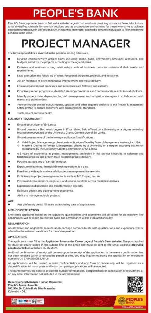 People’s Bank is seeking a dynamic and experienced professional to join our team as a Project Manager.