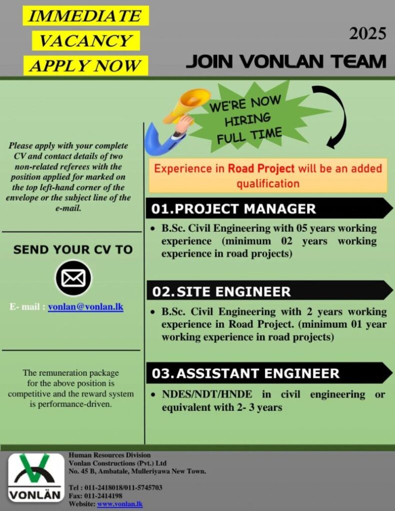Send your CV :- vonlan@vonlan.lk