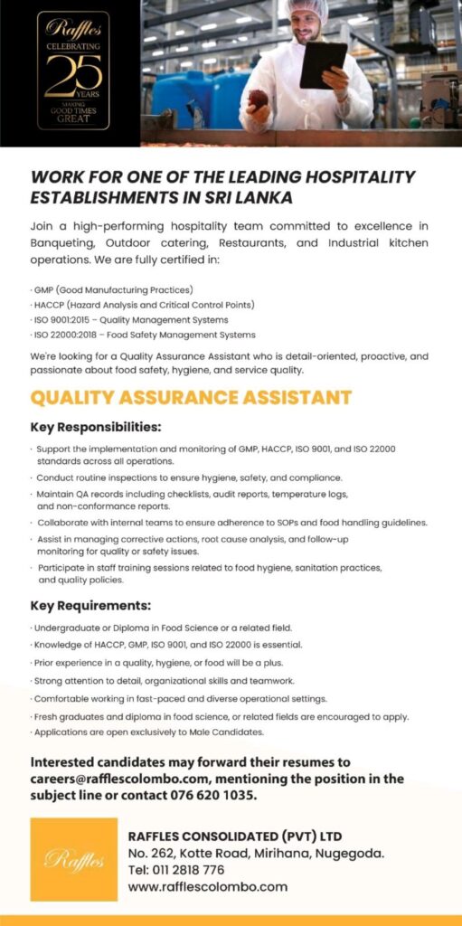Apply Online :- careers@rafflescolombo.com