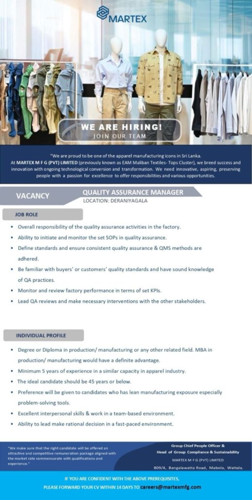 Martex M F G (Pvt) Ltd. is looking for an experienced QA Manager with strong knowledge in garment quality assurance, production standards, and compliance processes.